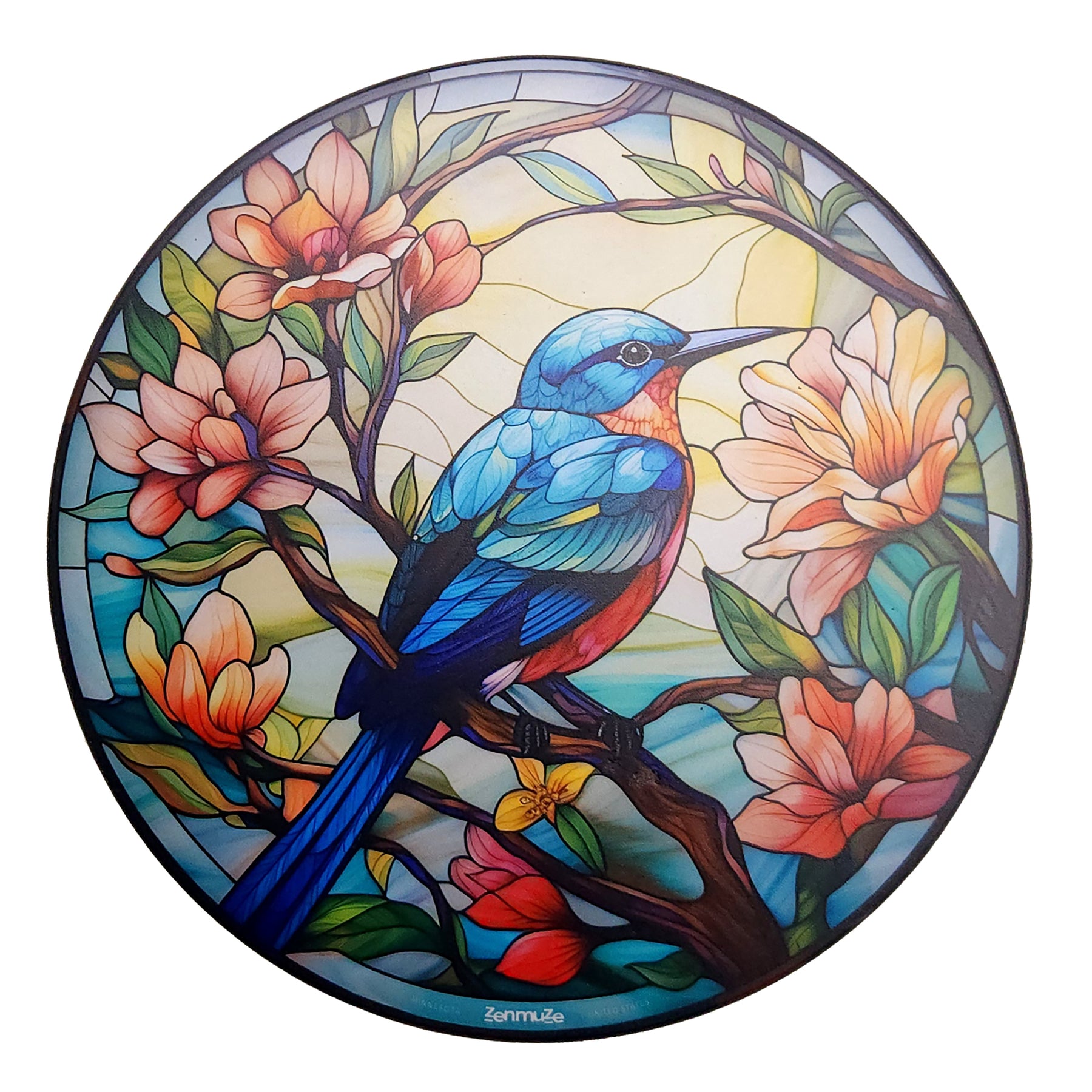 Bring a splash of color and cheer to your walls with this 12-inch wooden round wall hanger featuring a playful blue bird in a stained glass style. The vibrant design and smooth wood finish create a fun, eye-catching piece that brightens any space with a touch of artistic charm.